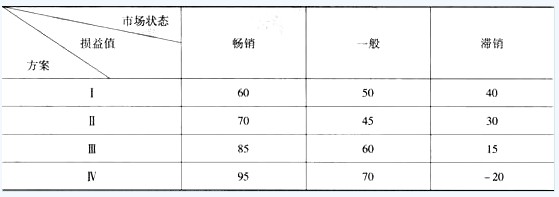 【试题解析】:最大值系数0.75,则最小值系数为0.25,各方案加权平均值如下,Ⅰ:60×0.75 40×0.25=55;Ⅱ:70×0.75 30×0.25=60;Ⅲ:85 ×0.75 15×0.25=67.5:Ⅳ:95×0.75 (-20)×0.25=66.25,取加权平均值最大者,即方案Ⅲ。