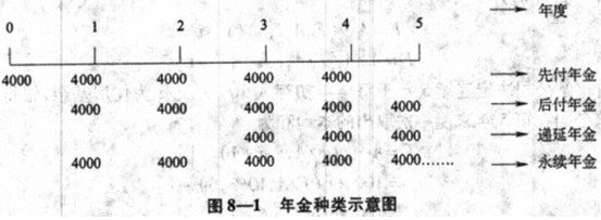 年金按其每次收付发生的时点不同,可分为后付年金、先付年金、递延年金、永续年金等几种(见图8-1)。