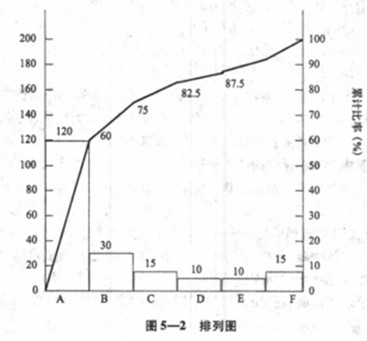 (4)制作排列图。排列图包括两根纵轴和一根横轴,左纵轴刻度代表不合格件数或频数,右纵轴刻度代表比率或频率,左纵轴上频数值要与右纵轴上的频率值相对应;横轴上将所统计各项依据频数从大到小依次排列。然后在横轴上按频数大小画出直方柱。在直方柱右边线上方标出累计值,用实线连接累计值点做出帕累托曲线(见图5—2)。