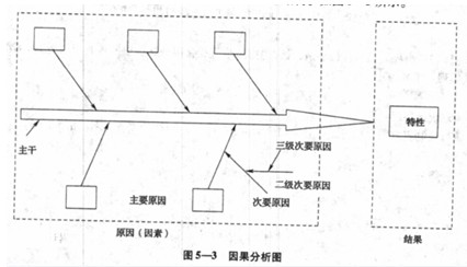 因果分析图文称特性要因图、树枝图或鱼刺图。因果分析图在质量管理过程中的主要作用在于通过深入剖析,找出质量问题与众多因素的因果结构。如图5—3所示。