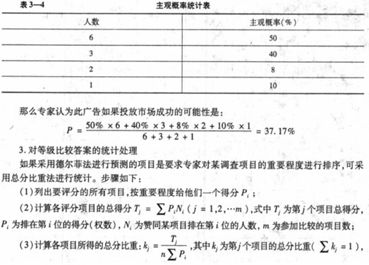 德尔菲法有时涉及对主观概率的统计处理,一般利用平均数法。主观概率是预测者根据自己的实践经验和判断分析能力,对某种事件在未来发生的可能性的估计数值。