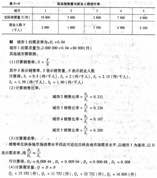 【例7】假设某公司的商品主要在五个城市销售,而且研究发现此商品与就业人数密切相关,公司记录2010年的各城市销售量如表3—5所示,经过对城市l市场的就业人员的抽样调查发现,2011年该市就业人员对公司这种商品的购买量将为每100人4件,试预测2011年这五个城市该种商品的需求量。