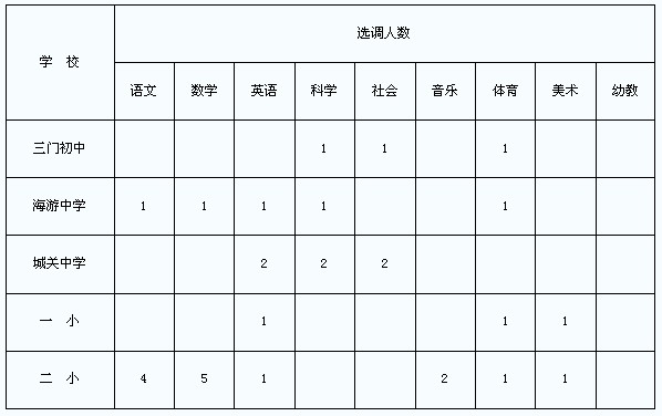 根据《三门县中小学教师进城公开选调办法》,2013年面向我县农村学校选调初中教师14名,小学教师17名。