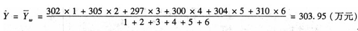 【例 13】 某商场历年的销售额数据分别为 302 万元,305 万元,297 万元,300 万元,304 万元,3lO 万元,试用加权平均法预测下一年度的销售额(权金数分别为 1,2,3,4,5,6)。