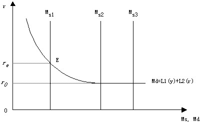 当利率非常低时,市场就会产生未来利率会上升的预期,这样货币投机需求就会达到无穷大,这时无论中央银行供应多少货币,都会被相应的投机需求所吸收,从而使利率不能继续下降而“锁定”在这一水平,这就是所谓的“流动性陷阱”。如图中的货币需求曲线中的水平部分 。