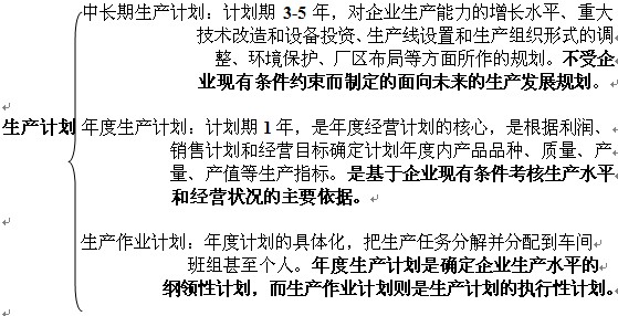 (一)概念:生产计划是企业在计划期应达到的产品品种、质量、产量和产值等生产任务的计划和对产品生产进度的安排,是指导企业计划期生产活动的纲领性方案。优化的生产计划必须具备以下三特征: