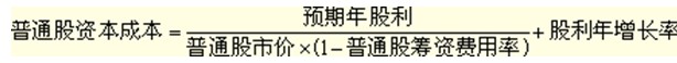 (3)普通股资本成本。这里的普通股指企业新发行的普通股。普通股和留存收益都是企业的所有者权益,因此它们的资本成本统称为“权益成本”;留存收益成本又称为内部权益资本成本,新发普通股资本成本可称为外部权益资本成本。普通股资本成本可以按照股利增长模式的思路计算,公式为: