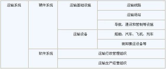要素:实现运输功能的基础设备、运输工具、工作人员、运输技术等。