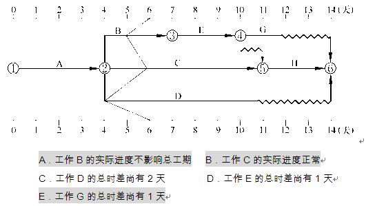例题:某分部工程双代号时标网络计划执行到第6天结束时,检查其实际进度如下图前锋线所示,检查结果表明(ABE)。