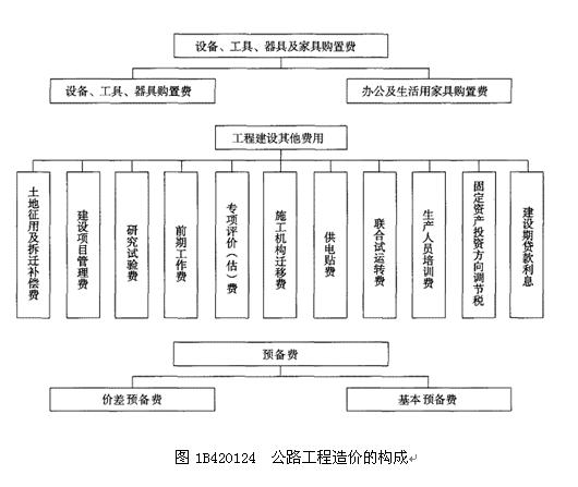 公路工程的造价是指公路工程交通基建、养护项目从筹备到竣工验收交付使用所需的全部费用,由建筑安装工程费,设备、工具(器具)购置费,工程建设其他费用,预备费四部分构成(图1B420124)。