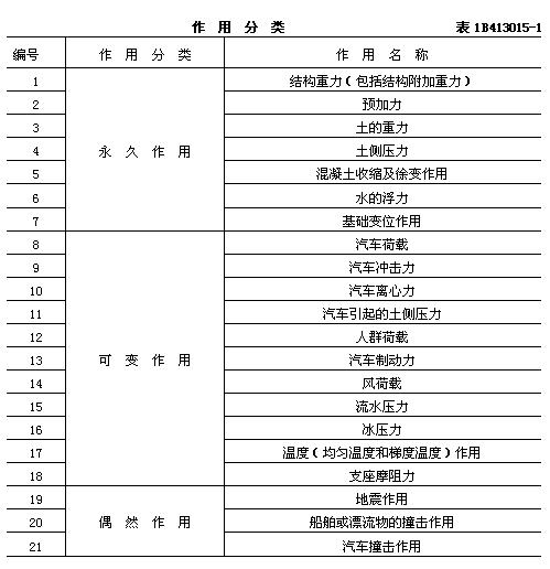 公路桥涵设计采用的作用分为永久作用、可变作用和偶然作用三类,规定于表1B413015-1.