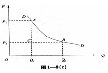 图1—8(c)描绘了一条Ed<1的需求曲线。从图中可以看出,在这条需求曲线上,价格下降的幅度大于需求量增加的幅度,所以DD为一条Ed<1 的需求曲线。当价格分别为P1、P2时,R1=P1 Q1=P2Q分别相当于矩形P1AQlO和矩形 P2BQ2O的面积,由于矩形P1ACP2大于矩形CBQ2Q1,因此,R1