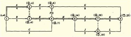 施工过程H、I、K进行流水施工以后,原关键线路AEHIK的总持续时间为(4 3 2 11)月=20关键线路发生变化,新的关键线路有两条,即线路AEHJL和线路AEHIL,计算工期都等于23个月(分别4 3 2 4 5 5=23;4 3 2 7 2 5=23),满足合同工期要求。