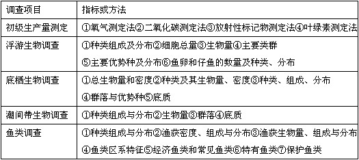 初级生产量、浮游生物、底栖生物、游泳生物和鱼类资源等,有时还有水生植物调查等,见表4--13.