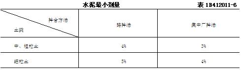 6. 水泥剂量水泥剂量应通过配合比设计试验确定,但设计水泥剂量宜按配合试验确定的剂量增加0.5%~1%,对集中厂拌法宜增加0.5%,对路拌法宜增加1%.当水泥稳定中、粗粒土做基层时,应控制水泥剂量不超过6%.水泥的最小剂量应符合表1B412011-6的规定。