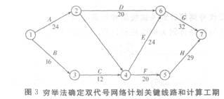 用穷举法确定双代号网络计划关键线路和计算工期如图3所示。
