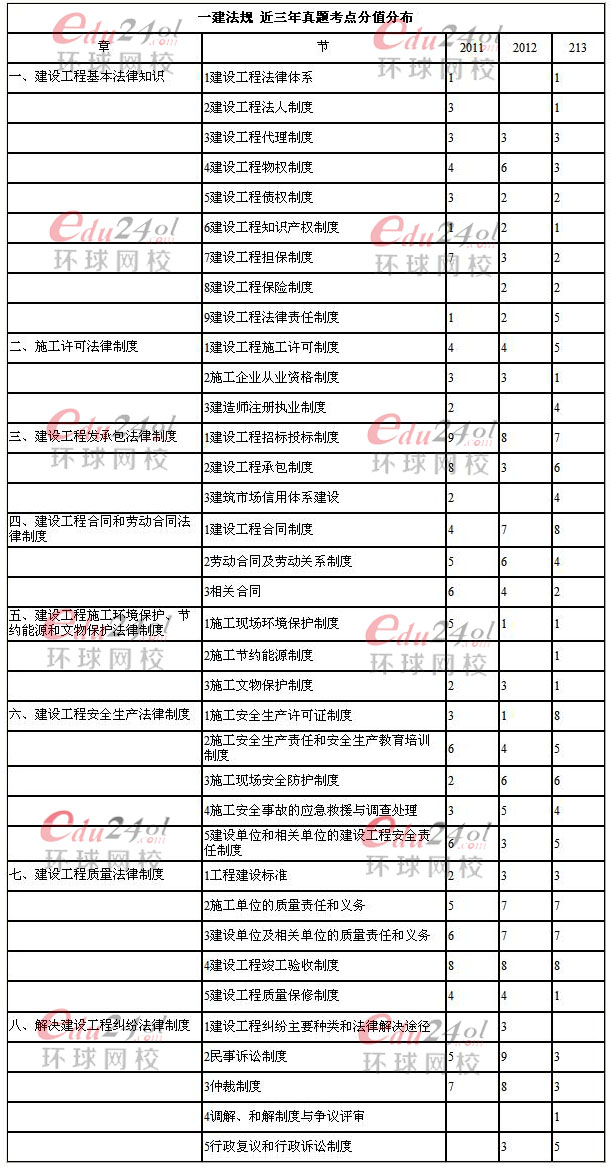 作为一级建造师的考试科目,《建设工程法规及相关知识》可谓是其中最基础的一科,同时也是相当重要的一门。而法规这个科目的特点是知识点繁多,因此复习起来也是比较麻烦。环球网校的小编为了帮助大家能够更好的复习,特地帮大家整理了2011年到2013年各章节占取的分值,希望能够帮助大家确定重点,方便复习。